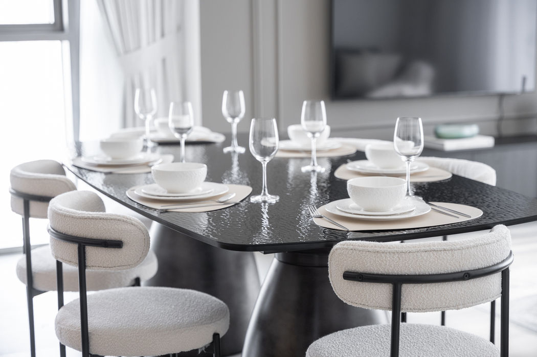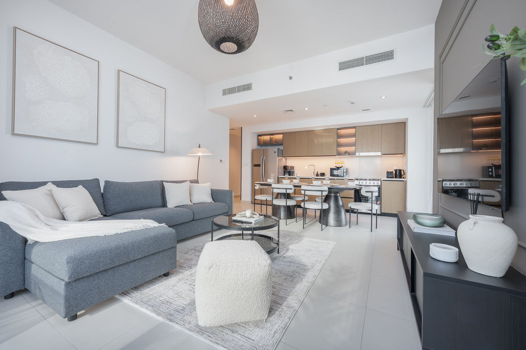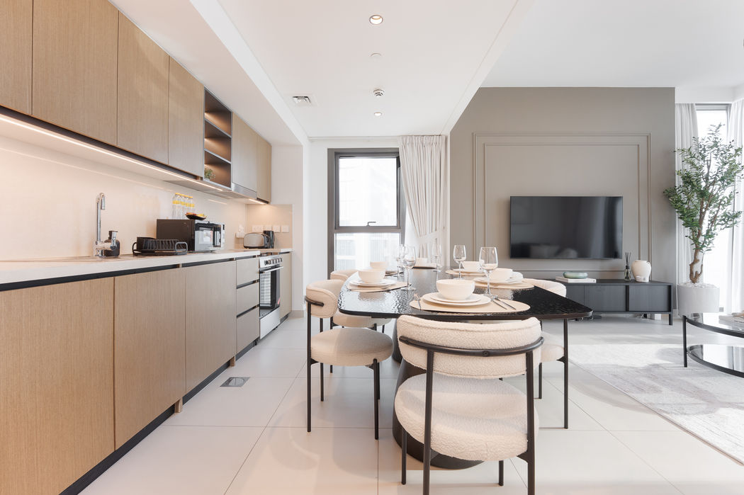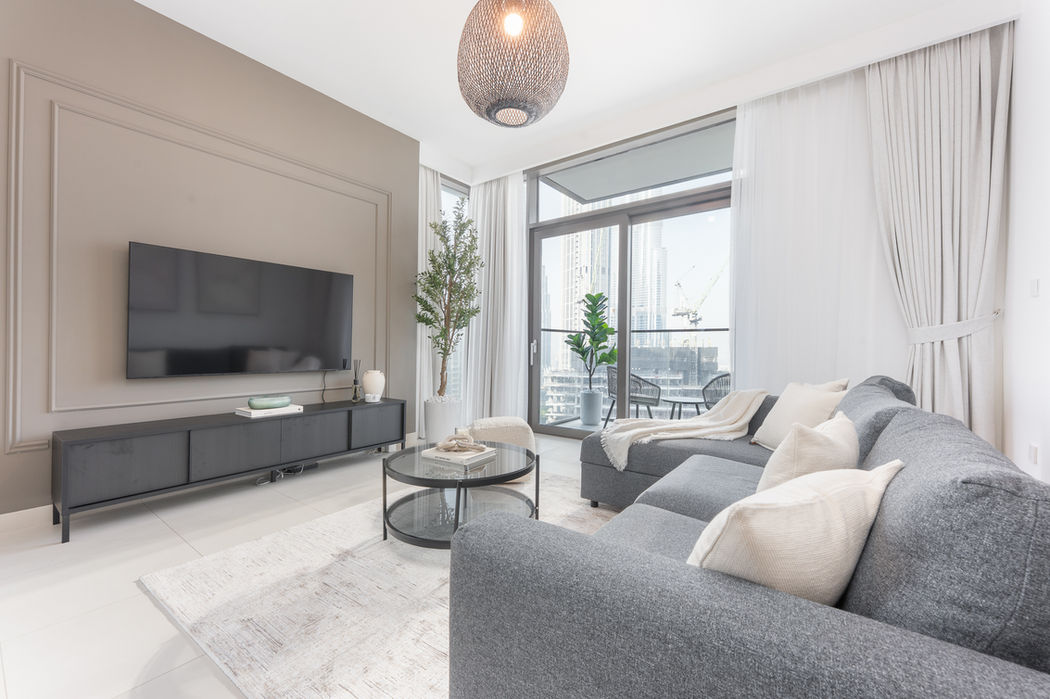 This two bedroom apartment in Downtown Dubai was furnished as a holiday home with a rich, earthy palette that brings depth and character to the space. Dark tones of brown and grey create a warm, grounded atmosphere that contrasts beautifully with the vibrant city just beyond its windows.