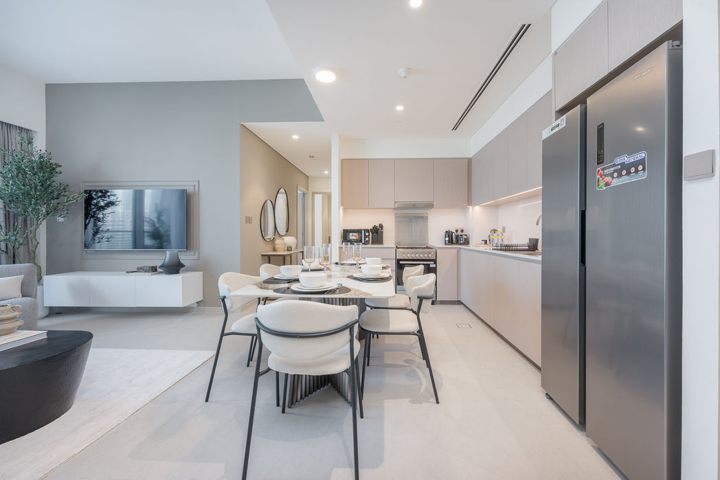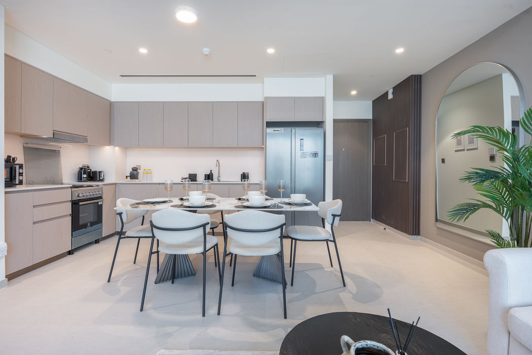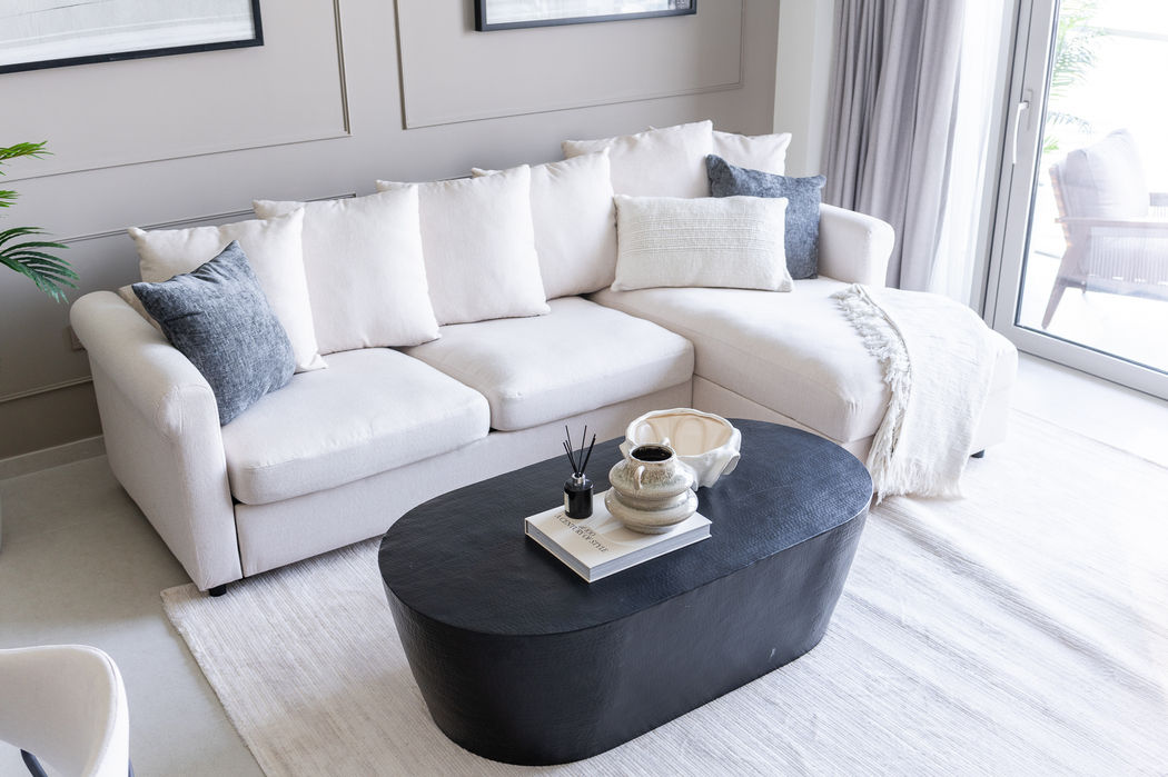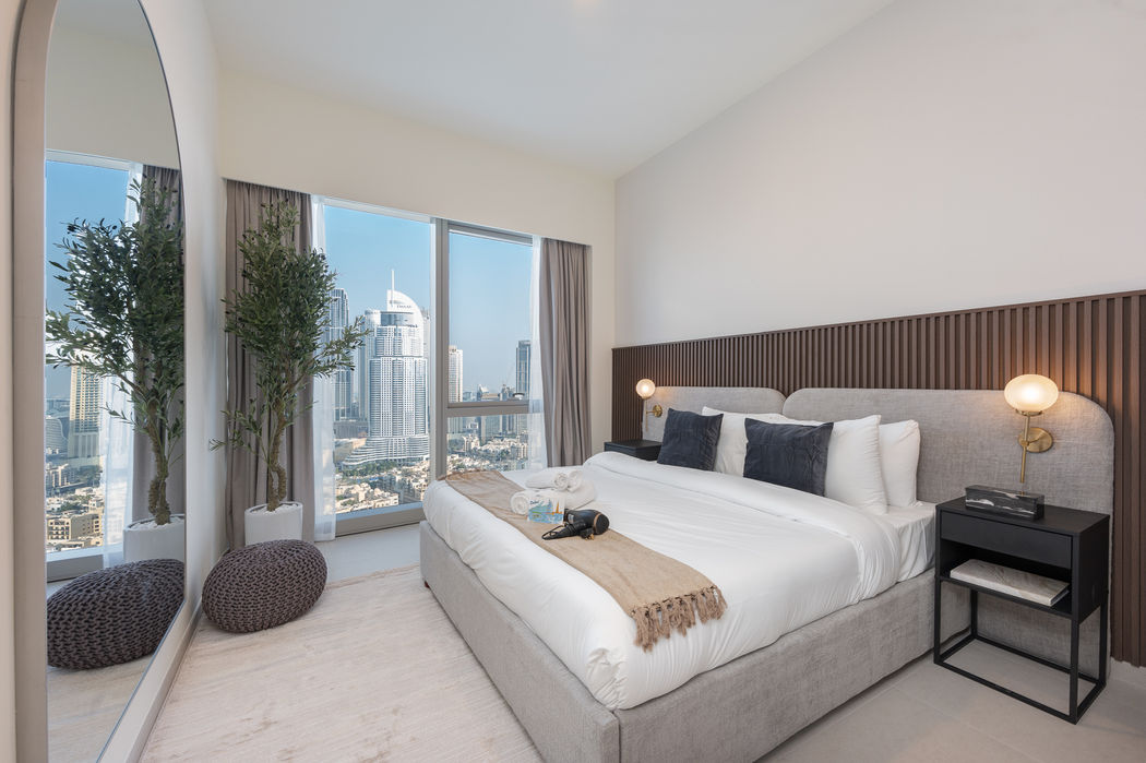 This sophisticated holiday home in Downtown Dubai was fully furnished in just three weeks. The design follows a minimalist approach, blending neutral and dark colors to create a calm and stylish atmosphere.