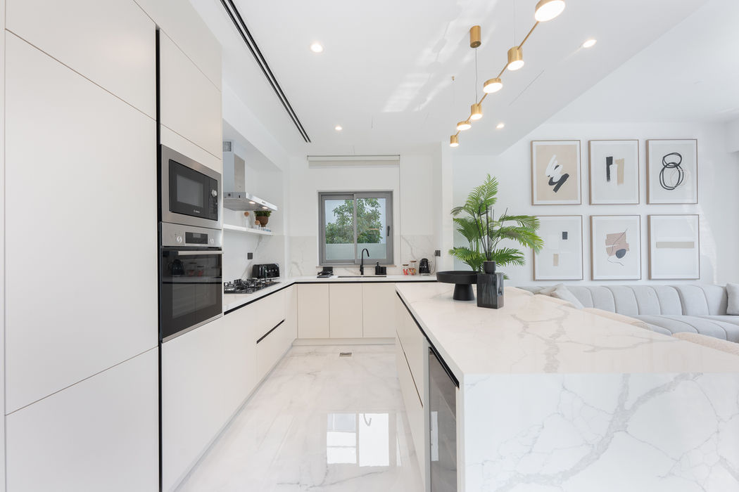 Throughout the home, premium tiled flooring was installed to unify the design. The kitchen was upgraded with a durable, modern countertop to enhance both form and function. All doors and wardrobes were repainted to refresh the interiors and establish a cohesive, clean palette.
